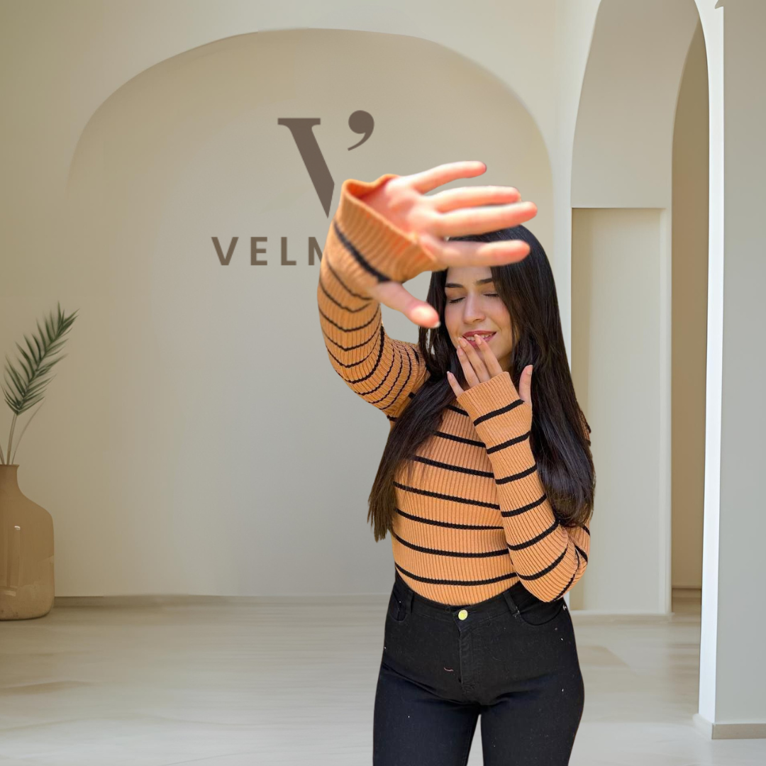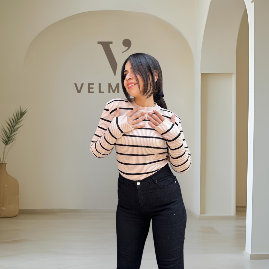 بيزك راوند مقلم من Velmora بخامة عجينة محمّلة تقيلة – مش ريب – بتديك إحساس بالنعومة والدفء في نفس الوقت.