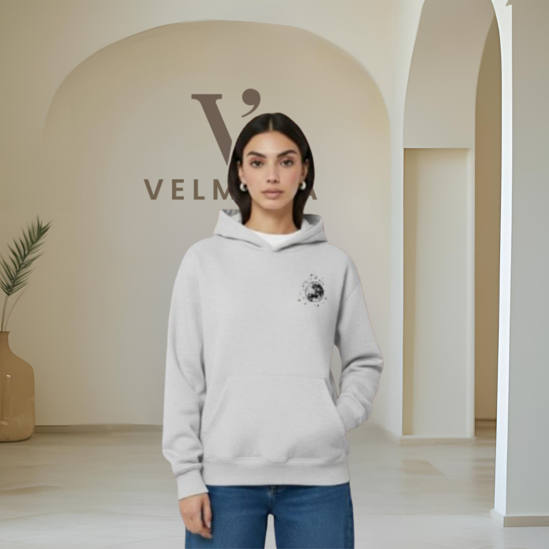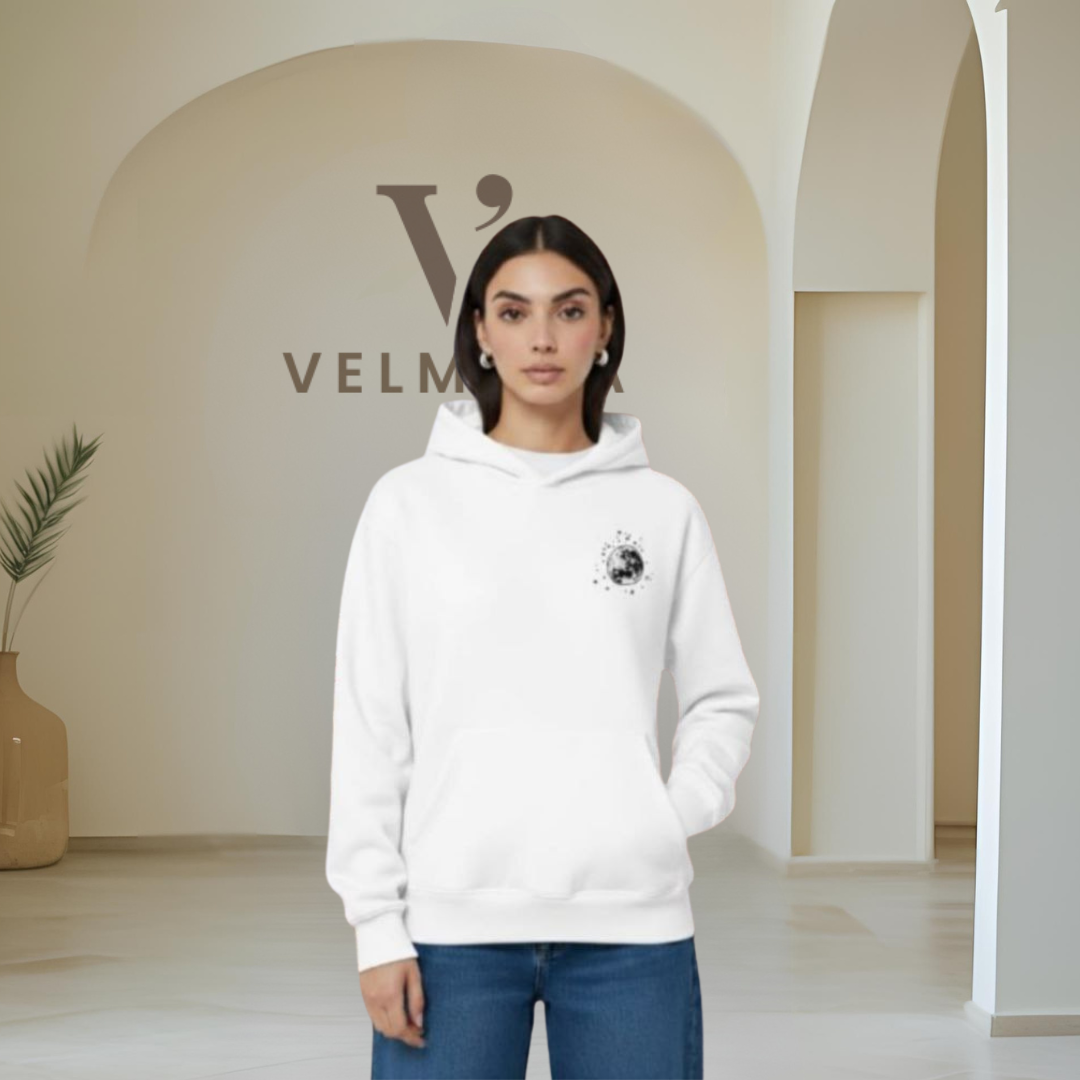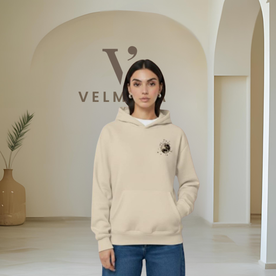 هودي الكواكب من Velmora بيجمع بين الراحة والستايل العصري بخامة ميلتون بلوش سميكة وناعمة تدفيك في البرد، مع طباعة كواكب تضيف لمسة playful وشبابية لكل خروجة.